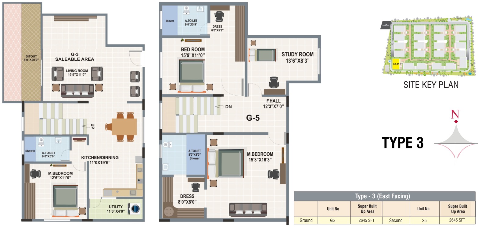 Commo areas will be provided with ceramic tiles and staircase with 20 mm granite.
